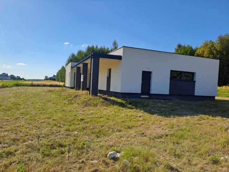 Nowoczesny, parterowy dom z dużymi trzyszybowymi oknami i wysokością pomieszczeń 2,7 m